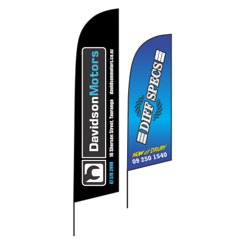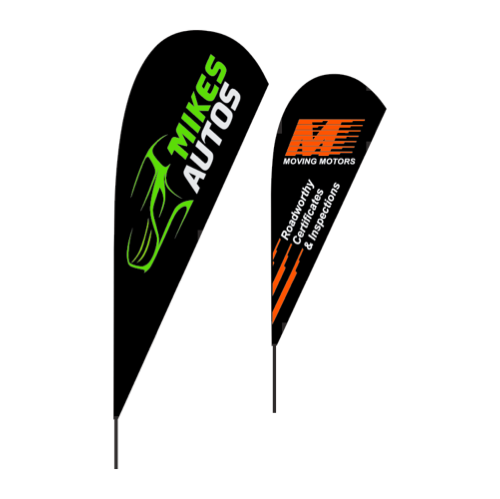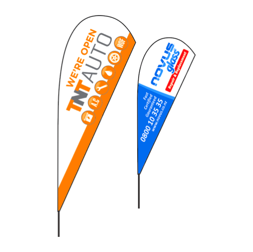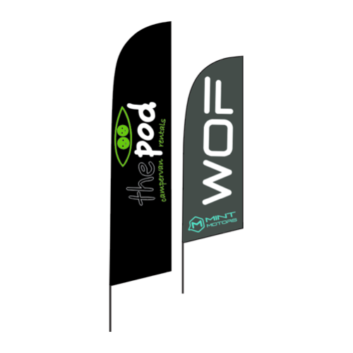 Durable promotional flags that get attention. Suitable for all weather, road side, inside, or at a trade show. Base options to suit and available in two sizes and shapes, single or double sided print.